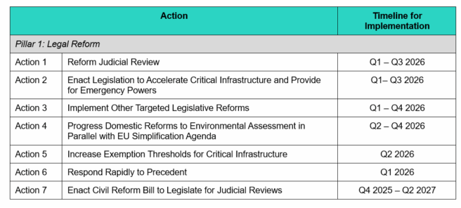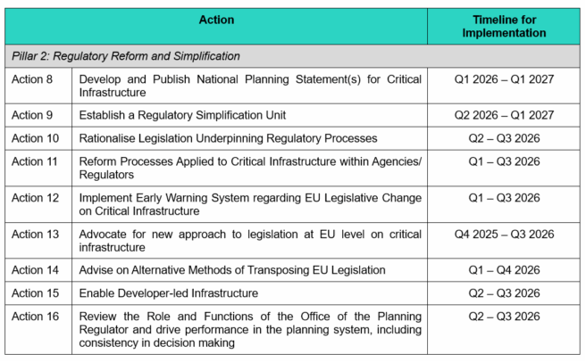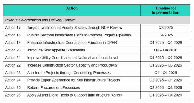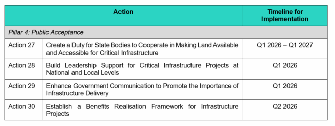 - sets out a timeline of thirty actions under four key pillars to assist acceleration of infrastructure delivery.
